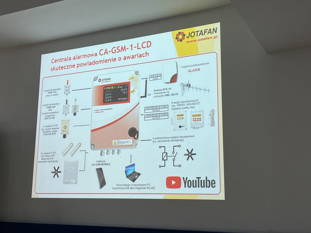 Film przedstawiony przez Pana Andrzeja Zagórskiego pokazał kolejne etapy uruchomienia wyposażenia w kurniku przed wstawieniem piskląt, sposób kontroli poprawności pracy wentylacji za pomocą świec dymnych. Ponadto studenci zapoznani się z systemem alarmowym: centralą alarmową CA-GSM-1-LCD. Zadaniem centrali jest powiadamianie o nieprawidłowościach występujących w obiekcie inwentarskim za pośrednictwem sieci telefonii komórkowej. W dalszej części wykładu Gość przedstawił system automatycznego ważenia drobiu WGJ-8 podczas odchowu ptaków. System składa się ze sterownika WGJ-8-LCD, który może obsługiwać do 16 szalek (WGJ-W do ważenia ptactwa lekkiego: kur, kaczek, przepiórek, itp., WGJ-I do ważenia indyków) zawieszonych w różnych miejscach w kurniku. Szalki mogą być pogrupowane, co pozwala na niezależne ważenie i podawanie danych statystycznych dla maksymalnie 8 stad (kurników). Masa ciała każdego ptaka jest rejestrowania indywidualnie wraz z datą i godziną wykonania pomiaru. Zastosowanie systemu automatycznego ważenia drobiu (zamiast ważenia ręcznego) wpływa na poprawę dobrostanu zwierząt, zwiększa bezpieczeństwo, zmniejsza poziom stresu oraz – co ważne dla hodowcy – obniża koszty pracy. Dodatkowo w każdym ze stad można zainstalować czujnik parametrów mikroklimatu (temperatury, wilgotności oraz stężenia dwutlenku węgla i amoniaku), z którego dane są zapisywane niezależnie od rejestracji ważeń z jednominutowym interwałem. Dzięki temu hodowca może udokumentować w jakich warunkach mikroklimatu był prowadzony chów. W trakcie spotkania z Panem Andrzejem Zagórskim studenci poznali system ważenia silosów WGJ-SILO. Jest to bardzo dokładny system monitoringu, rejestracji oraz dozowania paszy. Każda noga silosu stoi na jednym czujniku siły, który ma 10 ton zakresu pomiaru. Podczas spotkania ze studentami prelegent zaprezentował wiele ciekawych filmów oraz zdjęć z praktycznego działania systemów, a także z wizyt w gospodarstwach. W ostatniej części zajęć Pan Andrzej Zagórski przedstawił studentom działanie systemów AQUACUS oraz DUO-TIMER. AQUACUS służy do monitorowania wydawania paszy i wody. Wykresy pokazane przez Pana Andrzeja wskazywały czas pobierania paszy przez ptaki. Natomiast DUO-TIMER to system do sterowania oświetlenia, w którym można zaprogramować cykle świetlne. Zapewnienie wysokiego dobrostanu ptakom wymaga, by światło w kurniku nie było załączane i wyłączane gwałtownie; system pozwala na powolne (mogące trwać nawet do 90 minut) i płynne zwiększenie i zmniejszenie natężenia światła. Wszystkie zaprezentowane systemy JOTAFAN można dołączyć do Internetu i zdalnie nadzorować ich pracę z poziomu komputera PC i urządzeń mobilnych za pośrednictwem dedykowanej aplikacji FERMA-MOBILE. Podczas wykładu została zaprezentowana praca online omawianych systemów na przykładzie rzeczywistych kurników, z którymi połączono się zdalnie.