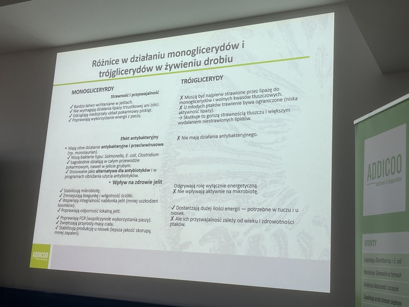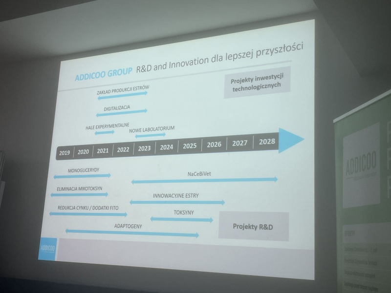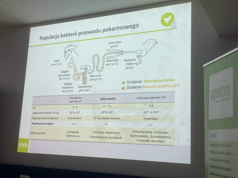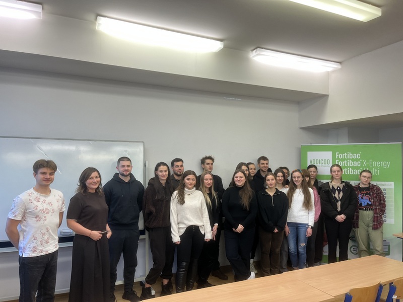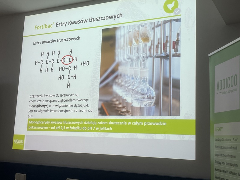 Firma Addicoo Group jest czeską firmą, która od niedawna rozszerzyła swoją działalność także na Polskę. Strategią firmy jest wprowadzanie na rynek dodatków paszowych, które poprawiają status zdrowotny zwierząt, a także samą ekonomikę produkcji. Dodatkowo firma oferuje programy wspomagania mikrobiomu przewodu pokarmowego dla drobiu, trzody chlewnej i bydła oraz działa prężnie prowadząc badania naukowe w celu rozwoju oferowanych produktów. W trakcie trwania pierwszej część zajęć Pani mgr inż. Adriana Jaroszek przybliżyła studentom historię firmy, a następnie przedstawiła bliżej najpopularniejsze produkty oferowane przez Addicoo Group: Fortibac®, Fortibac® X-Energy i Fortibac® Multi przeznaczone dla drobiu oraz Fortibac® i Fortibac® F Plus wykorzystywany w odchowie trzody chlewnej. Produkty doskonale działają w kierunku korzystnej stymulacji przewodu pokarmowego wspomagając rozwój i regenerację nabłonka jelit, stabilizację mikrobioty jelitowej, redukując stany zapalne w organizmie, finalnie wpływając także na poprawę wyników produkcyjnych.