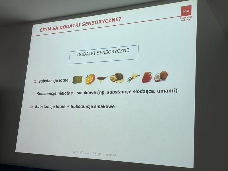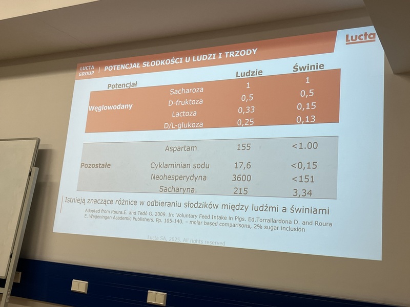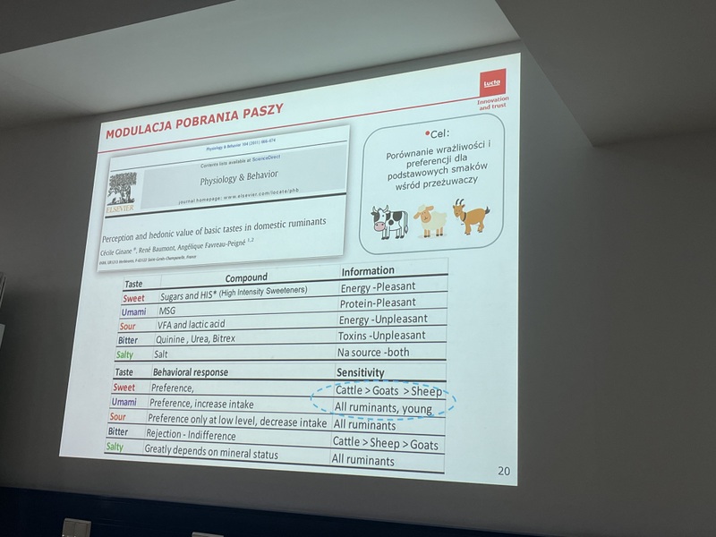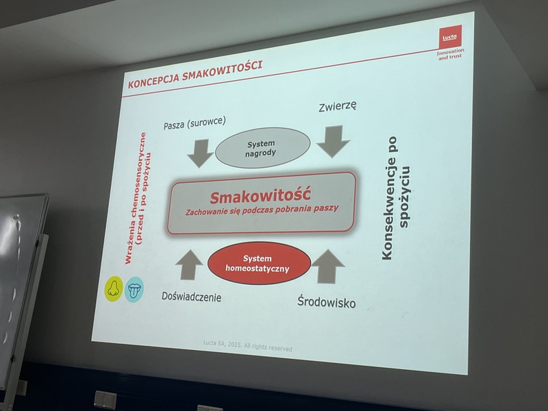 Drugą część zajęć poprowadził Pan Dyrektor dr inż. Marcin Kamiński, który na początku swojego wytapiania zapoznał studentów z najważniejszymi wydarzeniami w historii firmy. Lucta to hiszpańska firma założona w 1949 r. zatrudniająca globalnie ponad 1 tys. osób. Firma specjalizuje się w tworzeniu i produkcji dodatków sensorycznych dla zwierząt, a także aromatów do żywności i kompozycji zapachowych do chemii gospodarczej, które znajdują zastosowanie w różnych branżach. Dodatki sensoryczne dla zwierząt firmy Lucta odgrywają istotną rolę w poprawie smakowitości pasz oraz wpływają na zwiększenie jej pobrania. Firma Lucta dysponuje innowacyjnym zapleczem badawczym wchodzącym w skład Działu Innowacji zlokalizowanego na terenie Uniwersytetu Autonomicznego w Barcelonie. Centrum badawcze poza określaniem biologicznych aktywności dodatków paszowych, zajmuje się testowaniem najnowszych rozwiązań w żywieniu trzody chlewnej, przeżuwaczy oraz drobiu. Na początku spotkania Pan Dyrektor podkreślił znaczenie smaku i zapachu w żywieniu bydła i trzody chlewnej oraz jednoznacznie wskaz ich preferencje smakowo-zapachowe. Ponadto w trakcie swojego wstąpienia Pan Doktor przedstawił możliwości, które stwarza wykorzystanie dodatków sensorycznych w żywieniu wybranych grup zwierząt gospodarskich (bydło oraz trzoda chlewna).