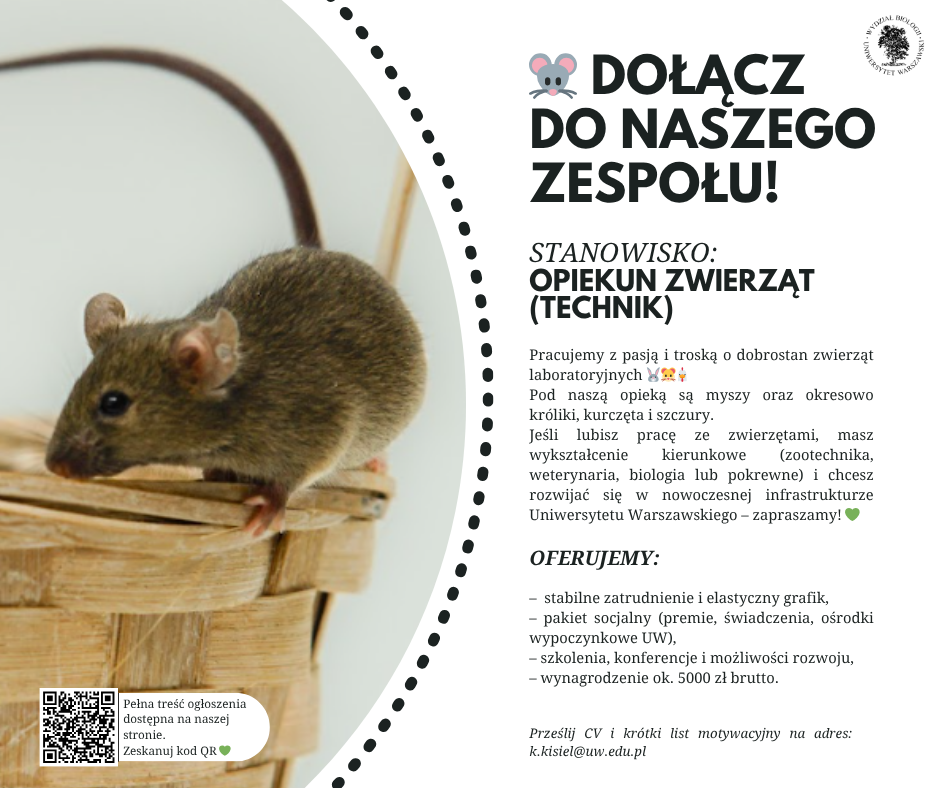 Jesteśmy zespołem zajmującym się utrzymaniem i hodowlą zwierząt laboratoryjnych do celów naukowych i edukacyjnych. Pod naszą opieką znajdują się na stałe myszy, a okresowo także króliki, kurczęta i szczury.